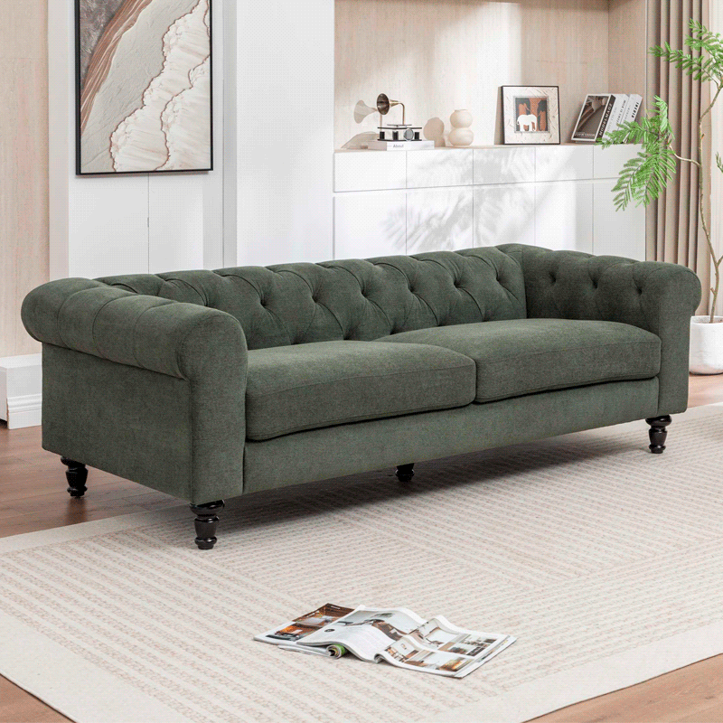 Диван тройка Chester е класическо и стилно решение, което внася лукс и елегантност във всеки интериор. Моделът е тапициран с мека и устойчива дамаска в топъл цвят, допълнена от характерните капитонирани детайли и заоблени подлакътници. Стабилността е гарантирана от здрава дървена конструкция, а комбинацията от пенополиуретан и покет пружини в пълнежа осигурява максимален комфорт при седене. Пълна информация за размерите и характеристиките на модела ще намерите в таб/поле "Техническа информация".