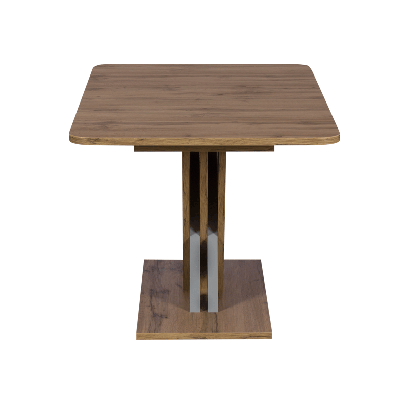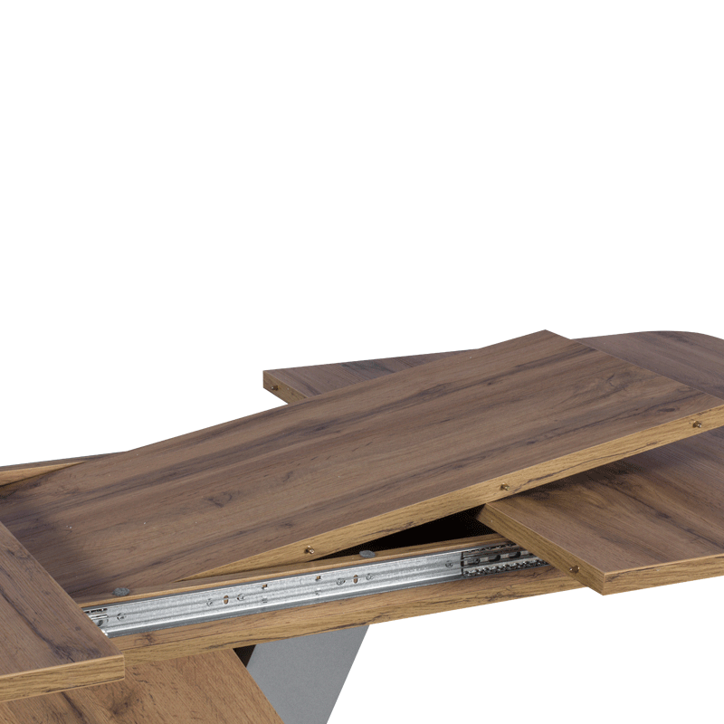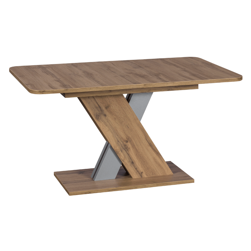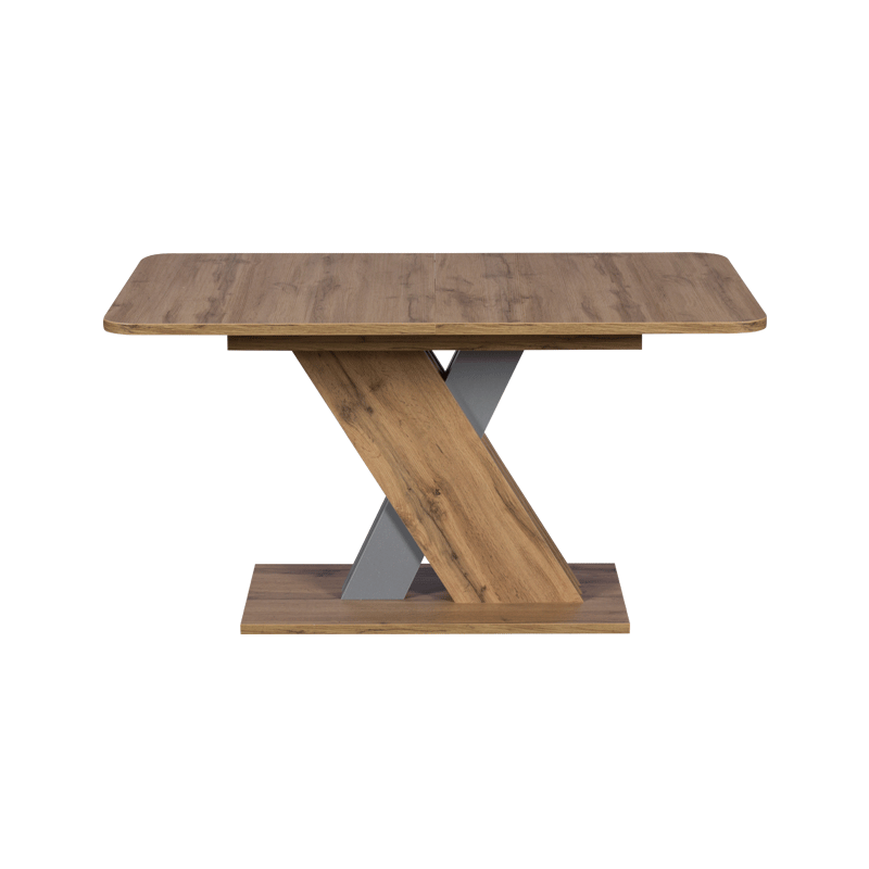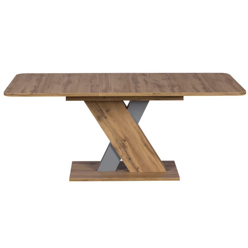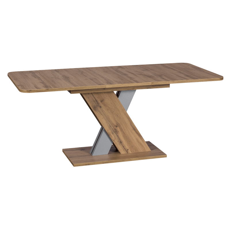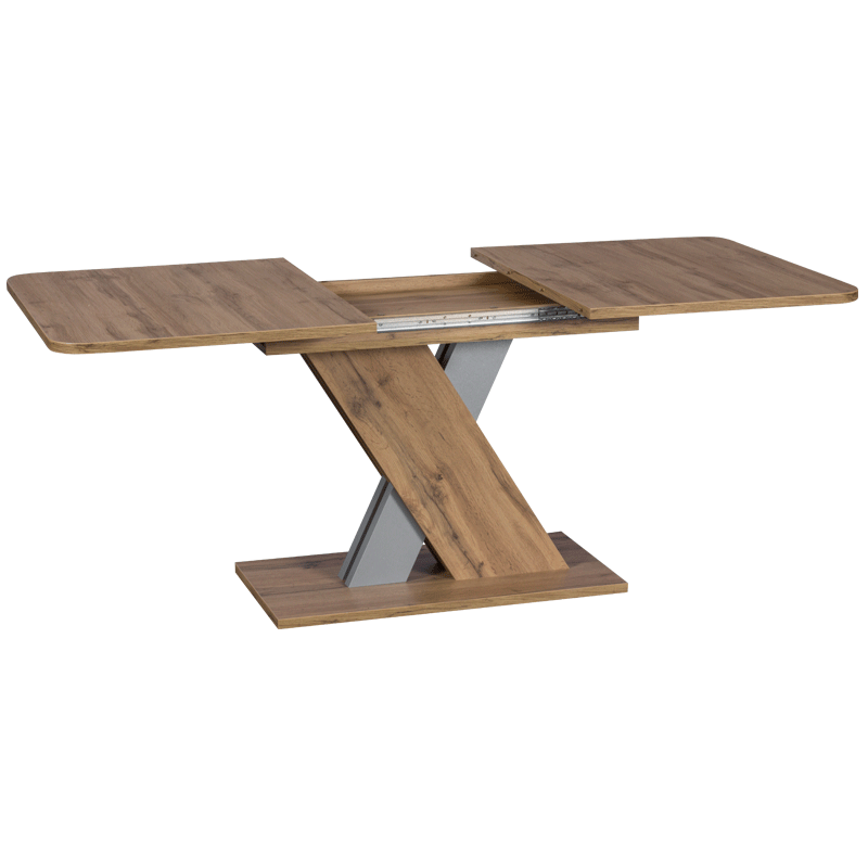 DINAR e модерна трапезна маса с функция за разтягане. Моделът е с интересна основа под формата на буквата Х. Плотът на масата е с дебелина 25 мм и размери 140 см. х 85 см. в стандартно положение и 180 х 85 см. при разтягане. Пълна информация за размерите и характеристиките на модела ще намерите в таблицата в таб/поле "Техническа информация".