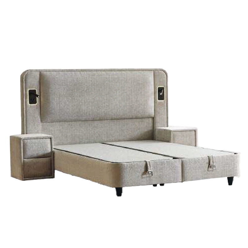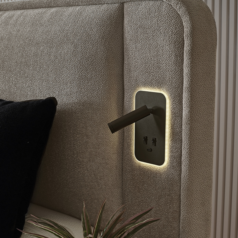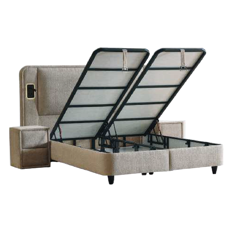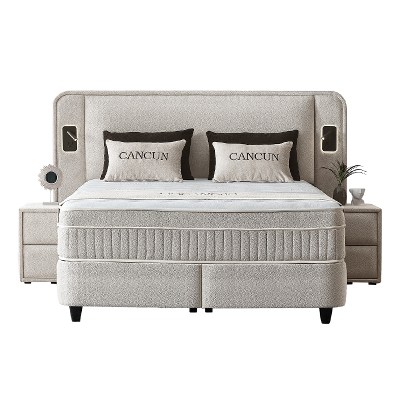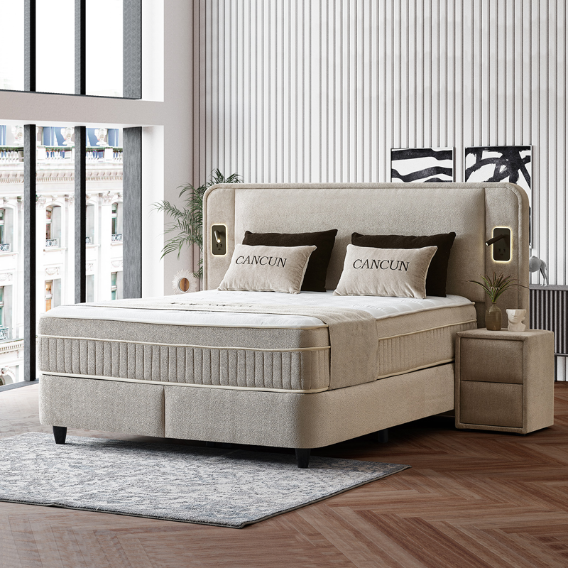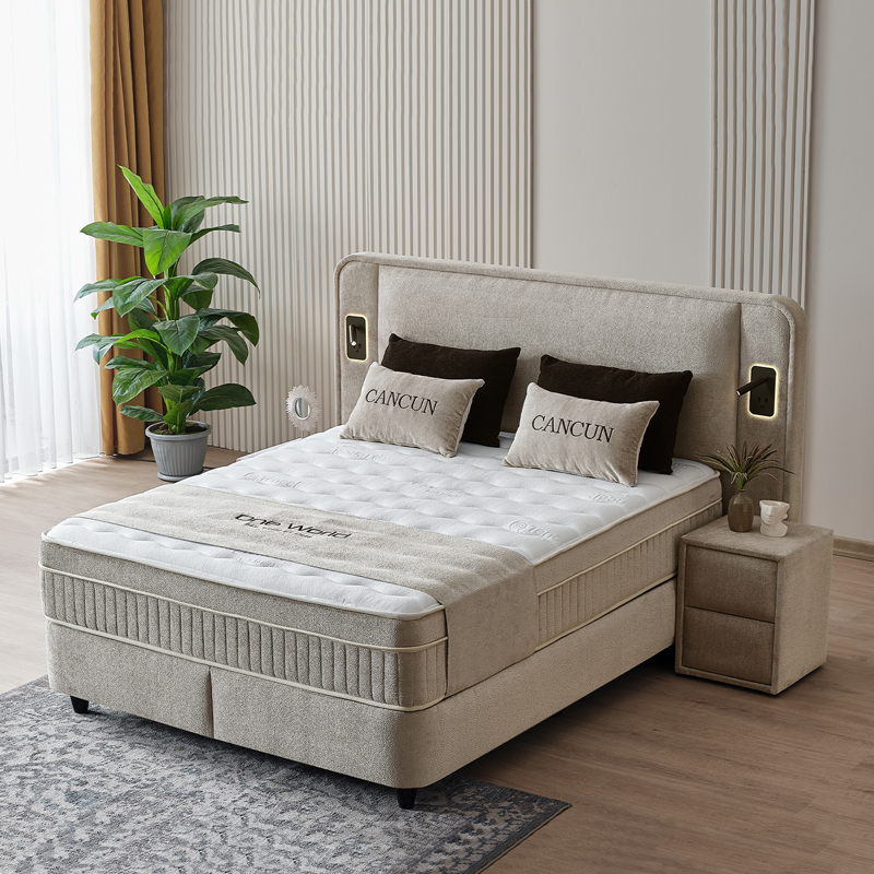 Тапицирана спалня с матрак CANCUN 180 x 200 в мек бежов тон впечатлява с изчистена и модерна визия, подчертано висока табла с мека тапицерия и вградени LED лампи от двете страни, които създават деликатно осветление за релаксираща атмосфера. Моделът е подходящ за просторни спални и предлага отлично съчетание от стил и практичност. Под матрака се крие функционална ракла за съхранение – идеална за спално бельо, възглавници и други вещи. Матракът е двулицев, с покет пружини, еластична пяна и пухена вложка, осигуряващи комфортно и меко усещане, съчетано с добра поддръжка на тялото. Пълна информация за размерите и характеристиките на модела ще намерите в таблицата в таб/поле 'Техническа информация'.