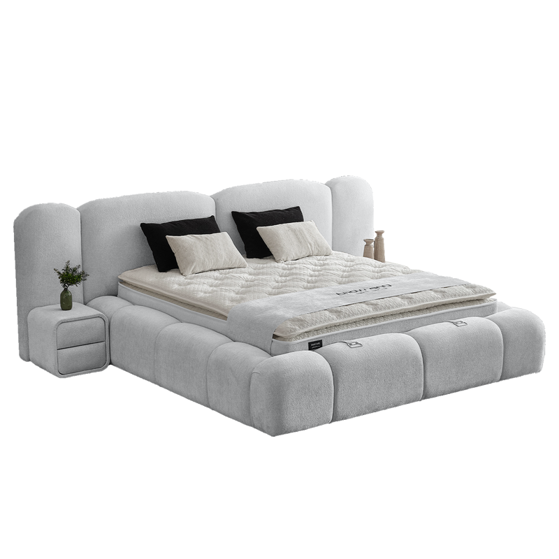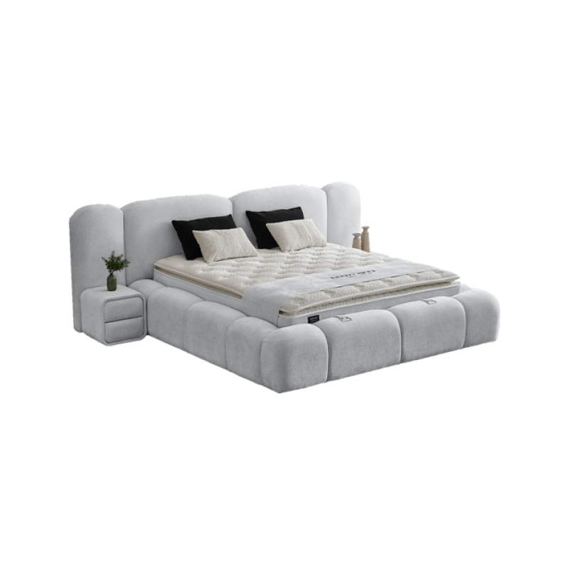 Спалнята BUMBY е елегантно и функционално решение, което внася модерен стил и усещане за чистота в интериора. Моделът е изработен със стабилна метална конструкция, съчетана с МДФ и ПДЧ, като цялата повърхност е тапицирана с качествена дамаска в класическо бяло. В комплекта е включен умерено твърд матрак с покет пружини, допълнен от пухена подложка и вложки от вълна и памук за оптимален комфорт. Подсилената метална подматрачна рамка позволява лесен достъп до практична ракла за съхранение на багаж, оптимизирайки пространството в помещението. Пълна информация за размерите и характеристиките на модела ще намерите в таб/поле "Техническа информация".