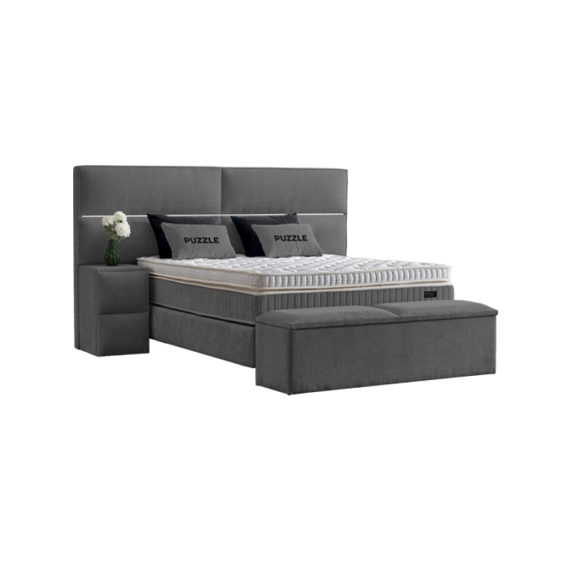 Тапицирана спалня с матрак PUZZLE 160 x 200 е стилен избор за всяка модерна спалня, съчетаващ елегантна визия с внимание към детайла. Високата табла с мека тапицерия и хоризонтален декоративен шев създава усещане за простор и хармония, а вградената LED светлина в централната линия придава фин завършек и уютна атмосфера. Моделът включва двулицев матрак с покет пружини, еластична пяна и пухена вложка, които осигуряват меко и приятно усещане при сън, съчетано с точкова поддръжка за тялото. Под стабилната подматрачна рамка се намира просторна ракла за съхранение – практично решение за подреденост в ежедневието. Моля, имайте предвид, че пейката и нощните шкафчета, показани на снимката, се продават отделно. Пълна информация за размерите и характеристиките на модела ще намерите в таблицата в таб/поле 'Техническа информация'.