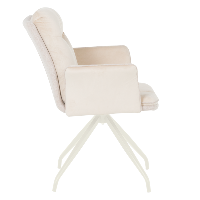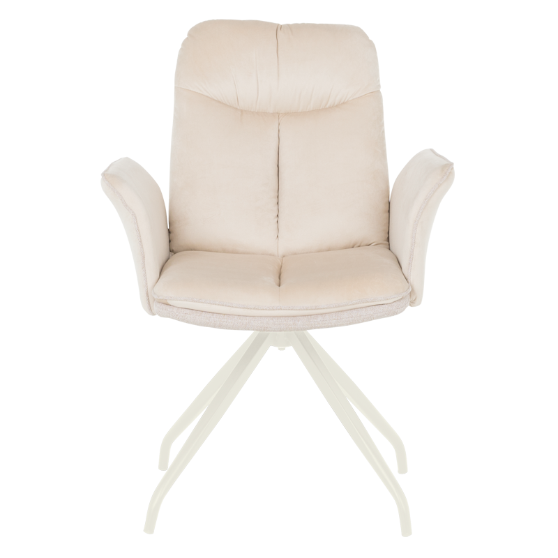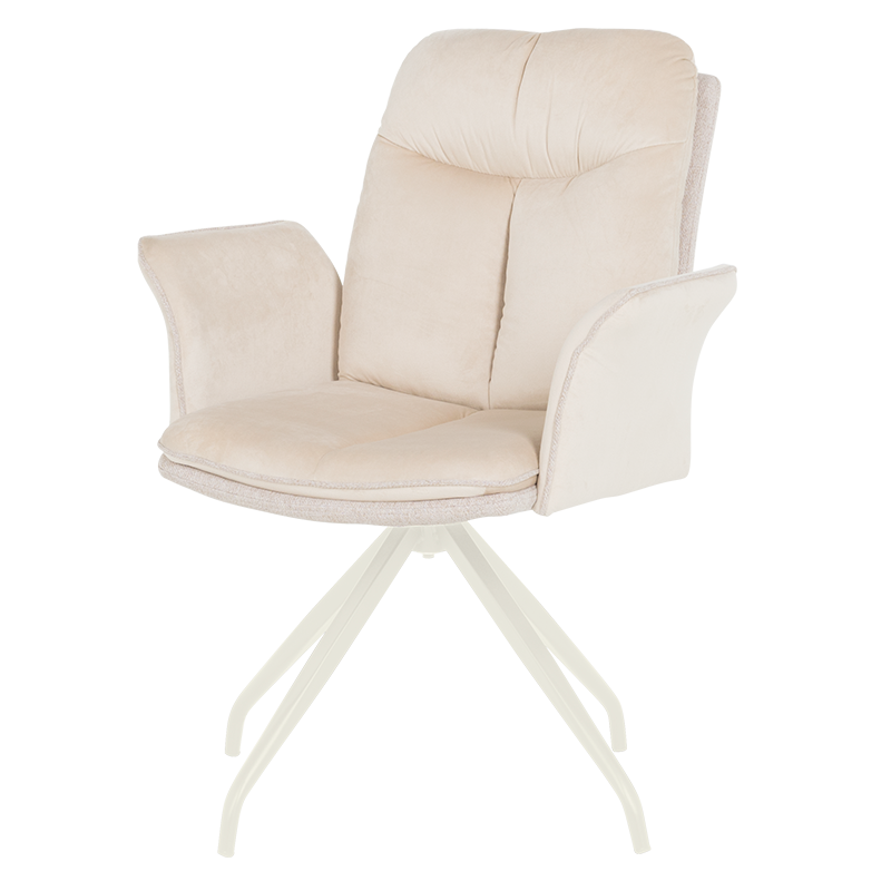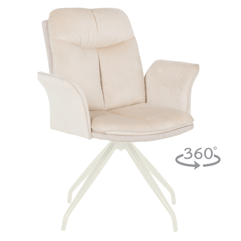 MARLOW 1 е трапезен стол с модерна визия. Той разполага с широки седалка и облегалка, тапицирани в мека дамаска, допълнени с възглавници за максимален комфорт. Подлакътниците повишават удобството на седящия. Основата е изработена от метал в елегантен кремав цвят и предлага иновативна функция за 360° въртене. Пълна информация за размерите и характеристиките на модела ще намерите в таблицата в таб/поле "Техническа информация".