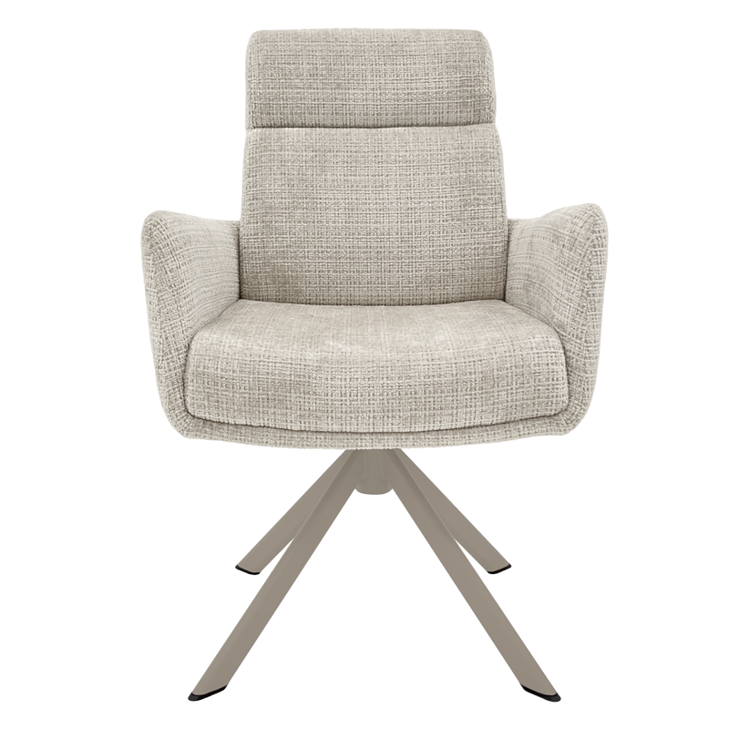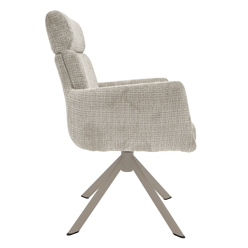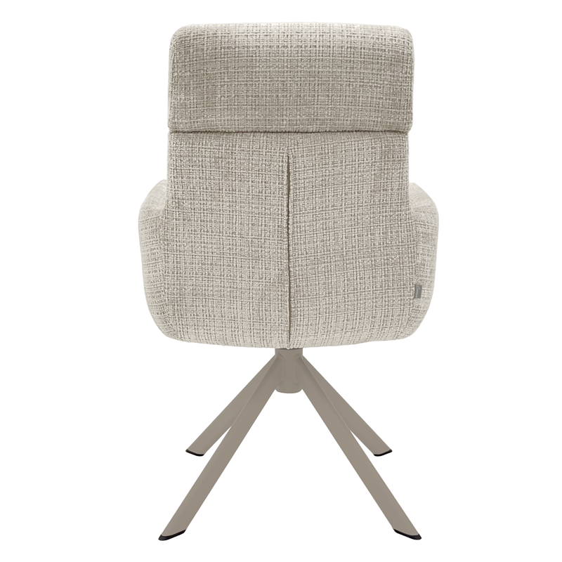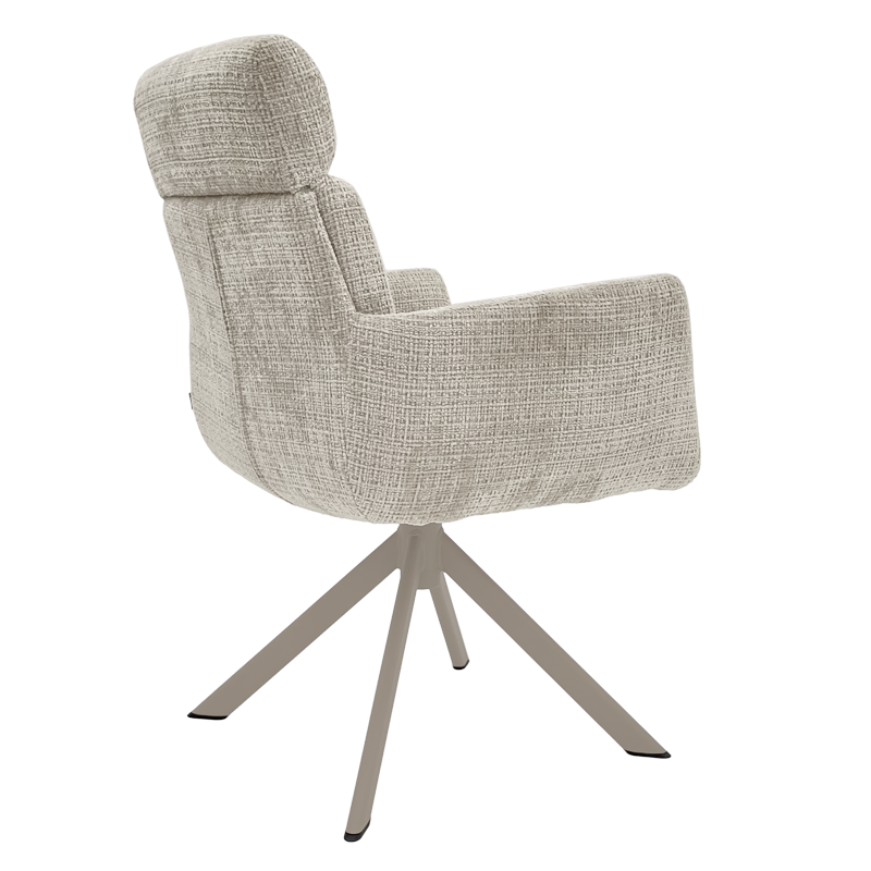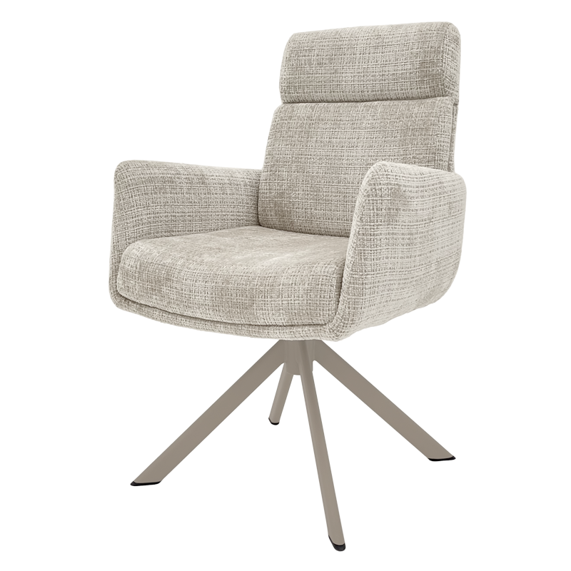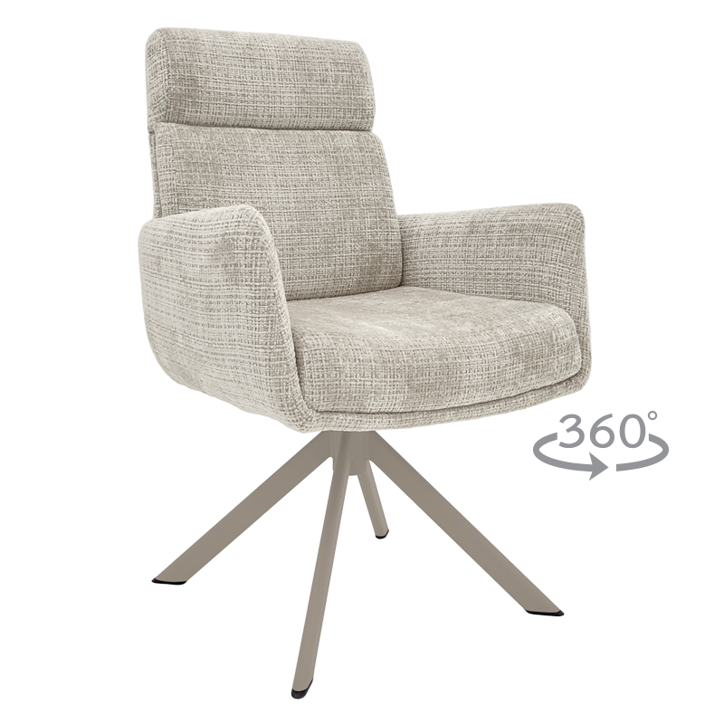 Трапезен стол TORVA е олицетворение на модерния комфорт, предлагайки елегантен дизайн с удобни подлакътници и мека тапицерия от издръжлива дамаска. За максимално удобство при продължително седене, седалката е подсилена със система от покет пружини и разполага с функция за люлеене. Здравата основа от праховобоядисан метал позволява пълно въртене на 360° и включва механизъм за автоматично връщане в изходна позиция. Този стол е създаден да издържи на натоварване до 120 кг, което го прави отличен и стабилен избор за всяка съвременна трапезария. Пълна информация за размерите и характеристиките на модела ще намерите в таблицата в таб/поле "Техническа информация".