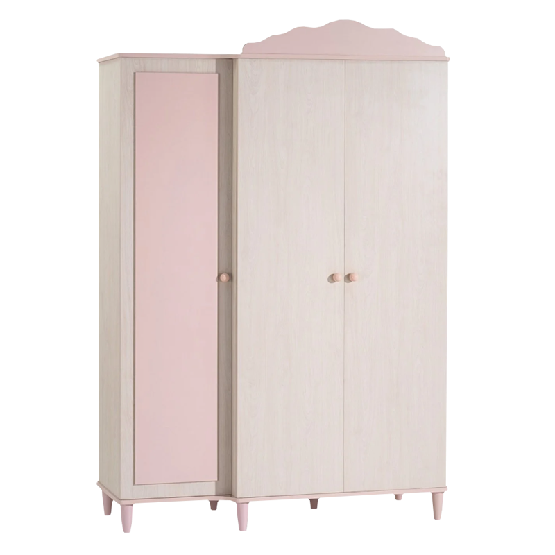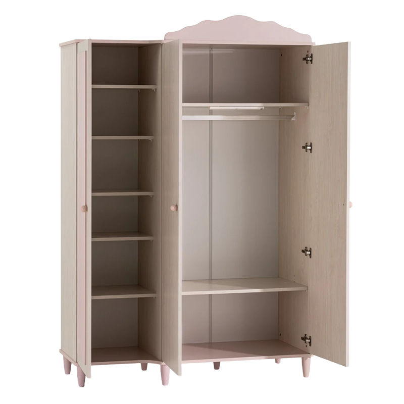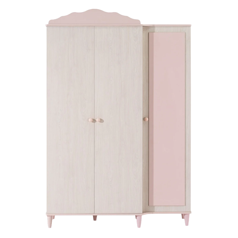 Гардеробът POLLINA с 3 врати комбинира мек розов акцент и светла дървесна текстура, създавайки нежна и хармонична атмосфера в детската стая. Модулната му конструкция позволява монтаж както отляво, така и отдясно, което го прави изключително адаптивен към различни разпределения в интериора.Моделът предлага широко място за закачалки със сензорно LED осветление, регулируеми рафтове с товароносимост до 25 кг и плавно затварящи се врати. Пълна информация за размерите и характеристиките на модела ще намерите в таблицата в таб/поле 'Техническа информация'.
