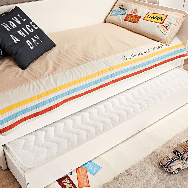 Чекмеджето за детско легло JOYIN 90 x 190 е практично решение на колелца, което може да се използва както за съхранение, така и като допълнително легло с тънък матрак. Отваря се само в една посока. Пълна информация за размерите и характеристиките на модела ще намерите в таблицата в таб/поле „Техническа информация“.
