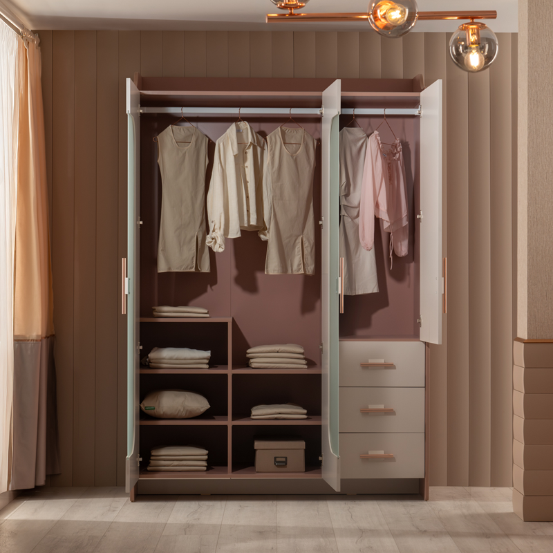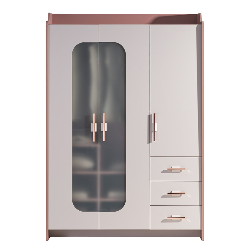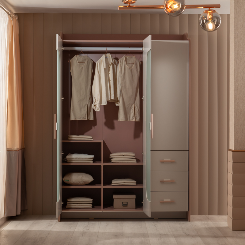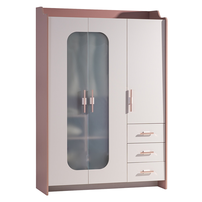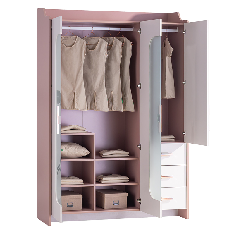 Трикрилен детски гардероб ESTELLA съчетава елегантна визия и практична функционалност – перфектен избор за стилна и подредена детска стая. Вграденото LED осветление със сензор осигурява отлична видимост в зоната за закачалки, а трите врати с тъмно тонирано темперирано стъкло добавят изискан акцент. Розово-златистите метални дръжки подчертават стилистиката и внасят нотка лукс. Моделът разполага с регулируеми рафтове и стабилни чекмеджета с плавно затваряне, всяко с товароносимост до 25 кг. За допълнителна свежест и защита на дрехите са предвидени две вентилационни отвора. Пълна информация за размерите и характеристиките на модела ще намерите в таблицата в таб/поле 'Техническа информация'.