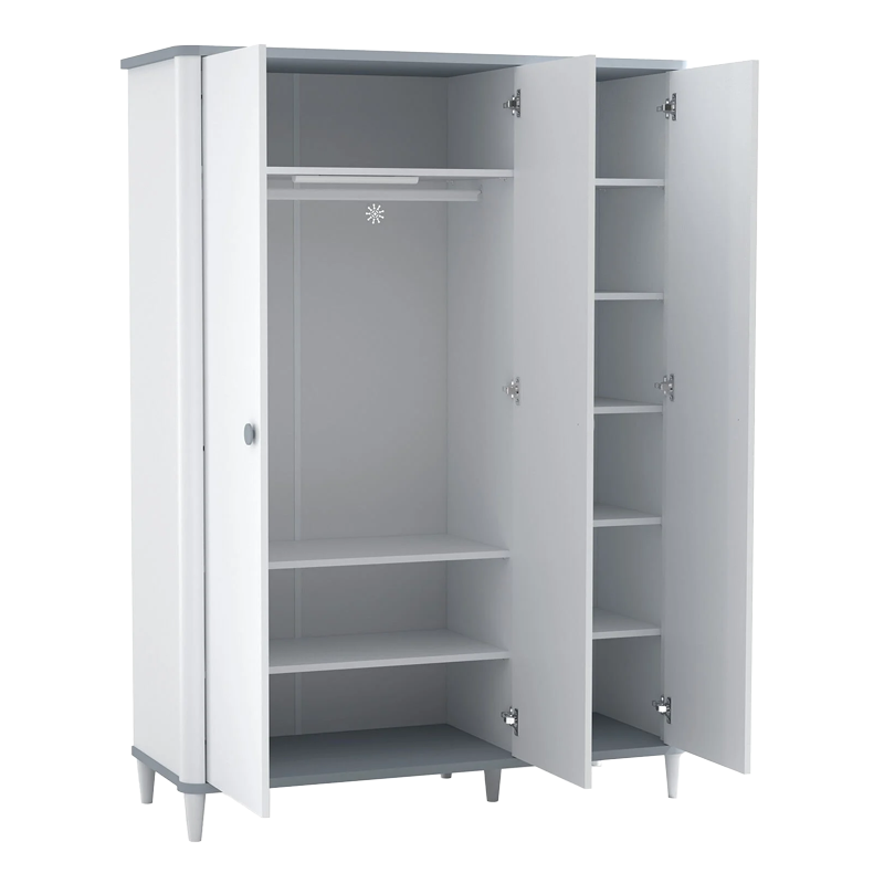 Трикрилният детски гардероб ADEN е създаден за максимална функционалност, като предлага просторен обем и редица удобства за организация. Гардеробът разполага с голяма зона за окачване, оборудвана с вградено LED осветление със сензор, което се активира при отваряне на вратите. Изработен е от 18 мм ПДЧ, а рафтовете му издържат до 25 кг и могат да се регулират според нуждите. Вратите са снабдени с механизъм за плавно затваряне, а високите 12 см ABS крака позволяват безпроблемно почистване с роботизирани прахосмукачки. Пълна информация за размерите и характеристиките на модела ще намерите в таблицата в таб/поле "Техническа информация".