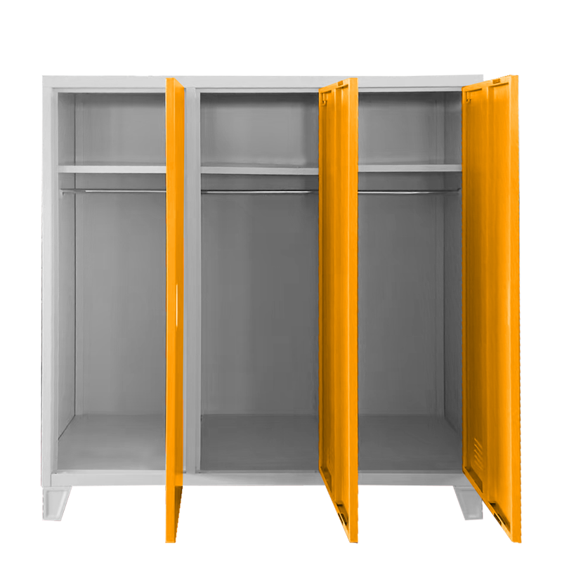 Метален шкаф Carmen CR-1605-3 JZ е троен метален гардероб с три плътни врати, които се затварят с помощта на магнитна система. Всяко отделение разполага с рафт с товароносимост до 40 кг, вграден лост за закачалки и вентилационен отвор за добра циркулация на въздуха. Моделът е снабден с крака с височина 10 см, които улесняват почистването под шкафа. Изработен е от праховобоядисан метал с грапаво-шагрен покритие. Подходящ е за оборудване на детски градини. Пълна информация за размерите и характеристиките на модела ще намерите в таблицата в таб/поле 'Техническа информация'.