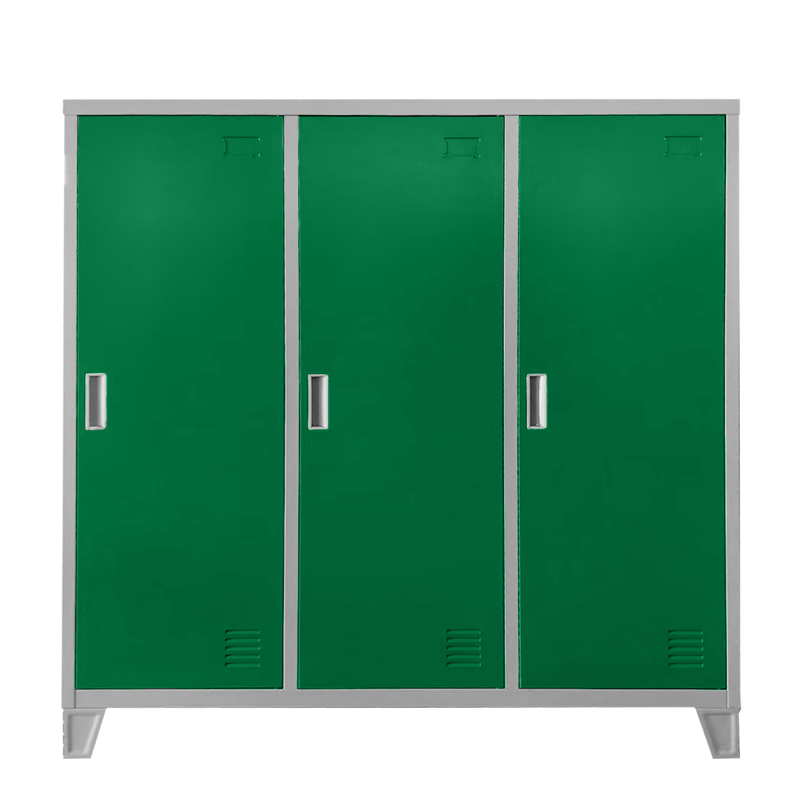 Метален шкаф Carmen CR-1605-3 JZ е троен метален гардероб с три плътни врати, които се затварят с помощта на магнитна система. Всяко отделение разполага с рафт с товароносимост до 40 кг, вграден лост за закачалки и вентилационен отвор за добра циркулация на въздуха. Моделът е снабден с крака с височина 10 см, които улесняват почистването под шкафа. Изработен е от праховобоядисан метал с грапаво-шагрен покритие. Подходящ е за оборудване на детски градини. Пълна информация за размерите и характеристиките на модела ще намерите в таблицата в таб/поле 'Техническа информация'.