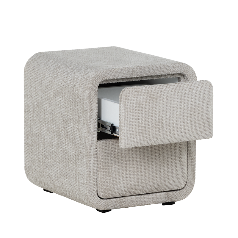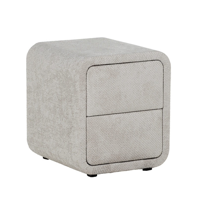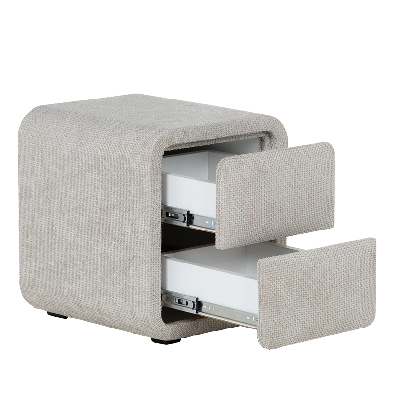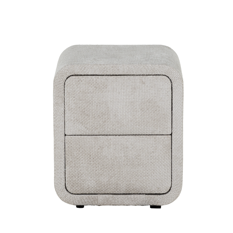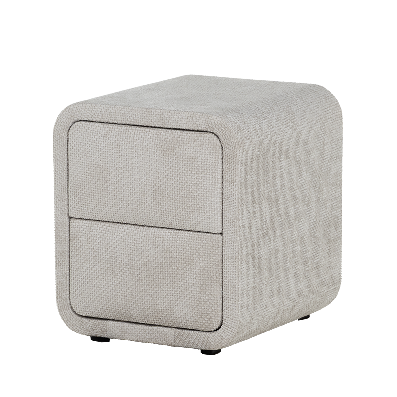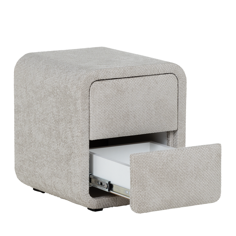 Нощно шкафче за спалня FABER в нежен нюанс слонова кост е елегантен и функционален акцент към всяка модерна спалня. Отличава се със заоблени форми, изцяло тапицирани с висококачествена текстилна дамаска, които омекотяват визията и придават уют на интериора. Моделът разполага с две плавно отварящи се чекмеджета, подходящи за съхранение на книги, аксесоари и лични вещи. Неговият компактен размер го прави идеален избор както за самостоятелна употреба, така и в комбинация с легла от същата серия. FABER съчетава модерен минимализъм с практично предназначение.